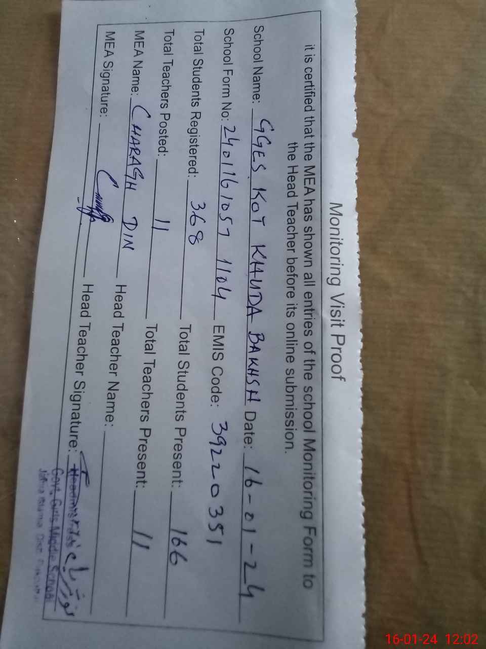 | EMIS Code: 39220351 | Name of School: GGES KOT KHUDA BUKSH | |||
