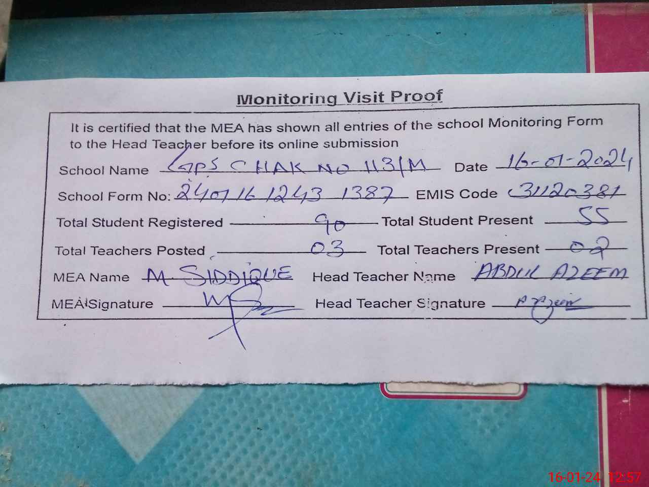 | EMIS Code: 31120381 | Name of School: GPS CHAK NO. 113 M | |||