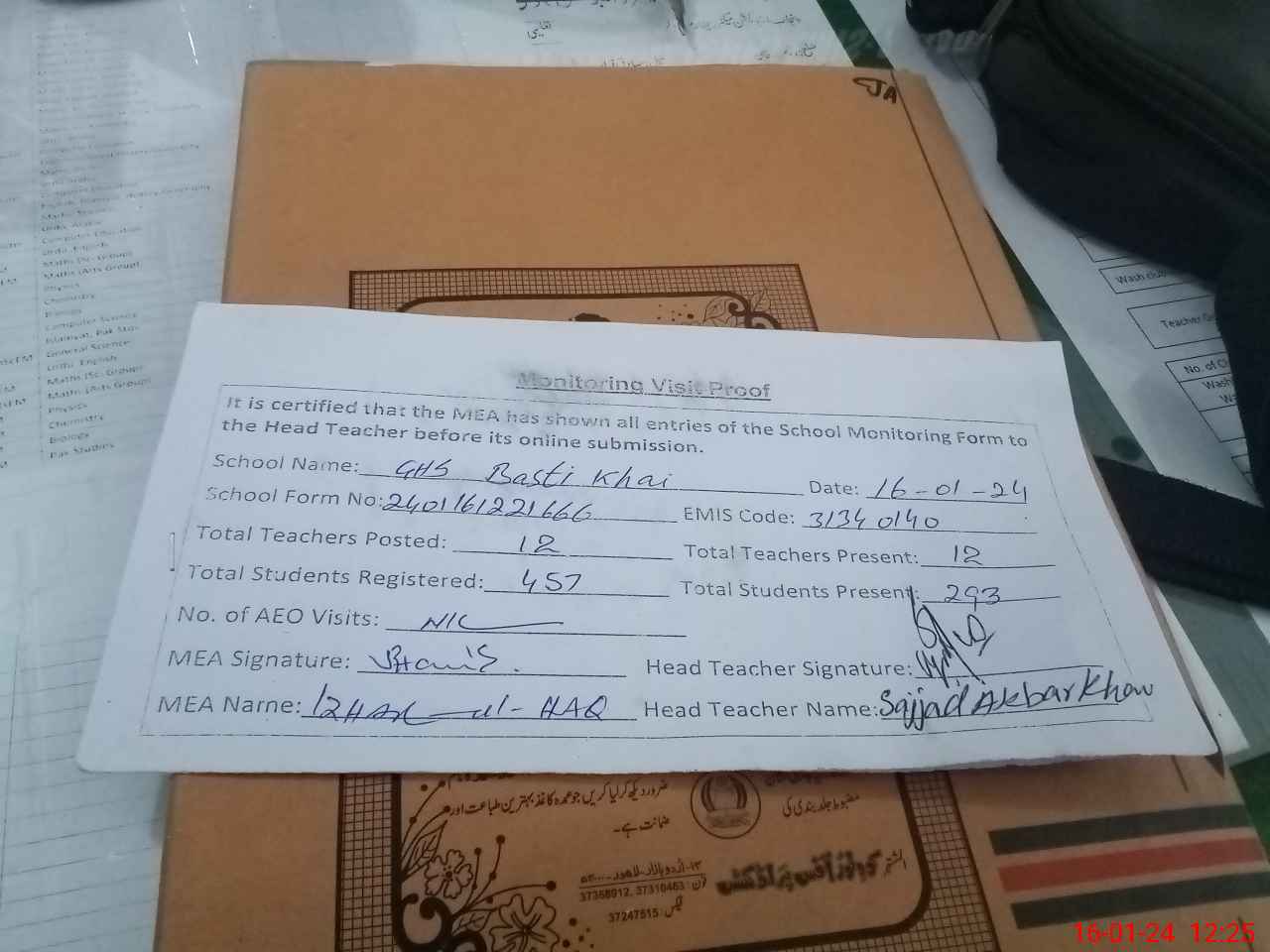 | Attendance Register | Head Teacher | MEA with School | Visit Proof |