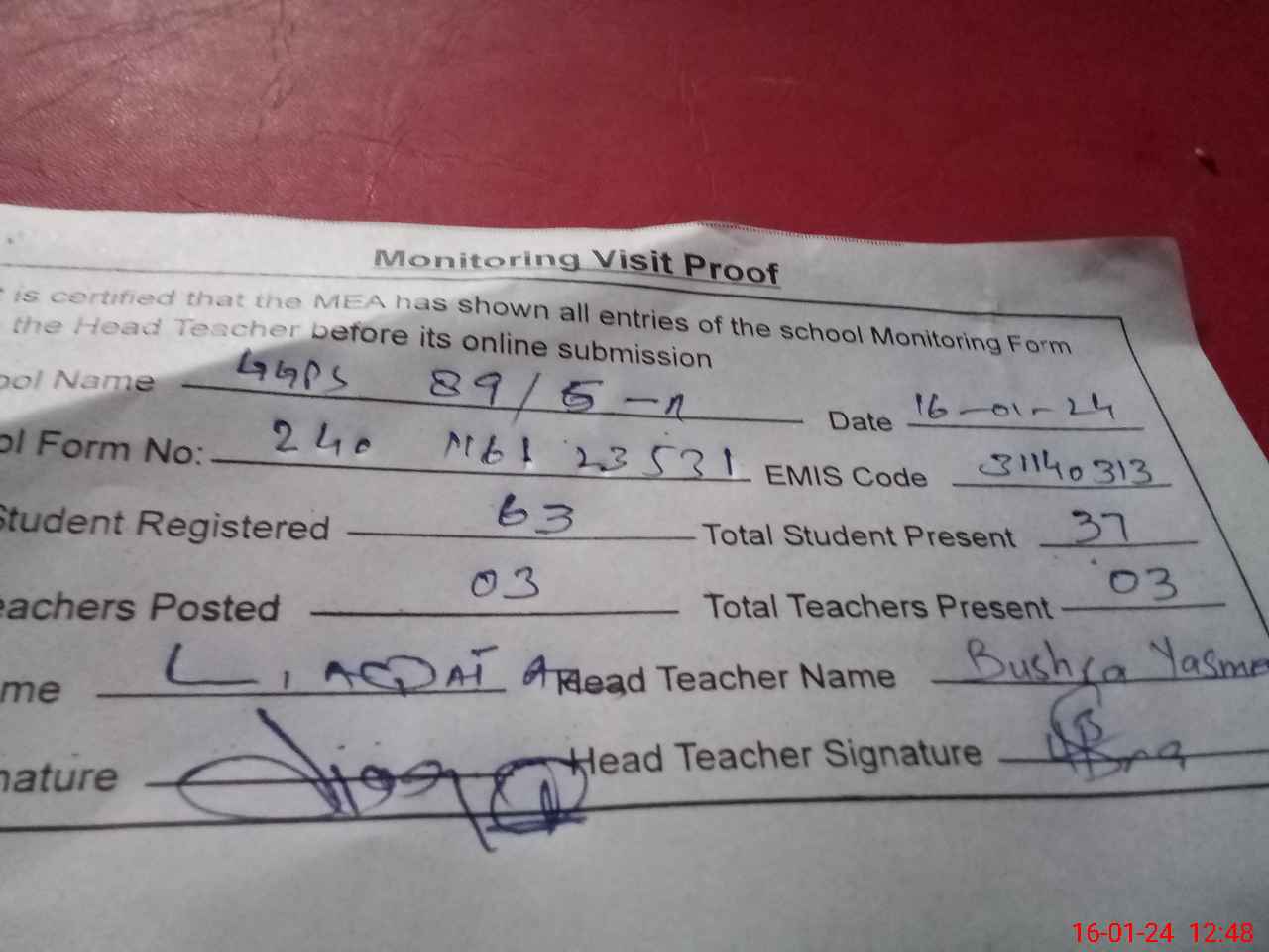 | Attendance Register | Head Teacher | MEA with School | Visit Proof |