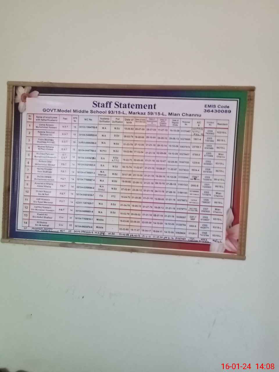 | EMIS Code: 36430089 | Name of School: GGHS MODEL 93/15-L, MIAN CHANNU | |||