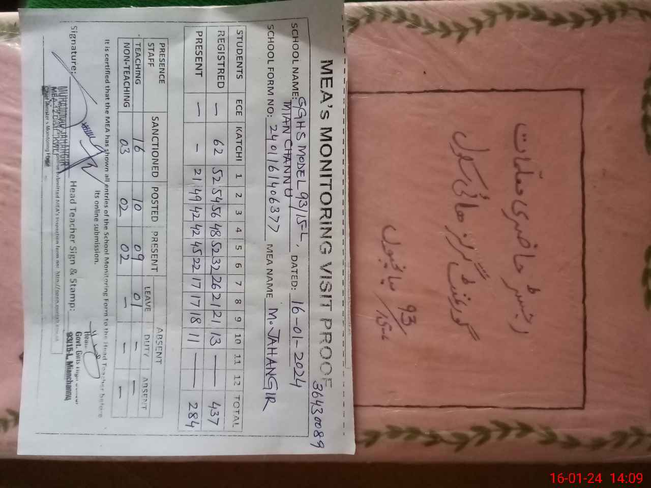 | Certified that this School was Inspected by the Undersigned MEA/DMO Today and the Information Stated Above is as Per Record. | |||||