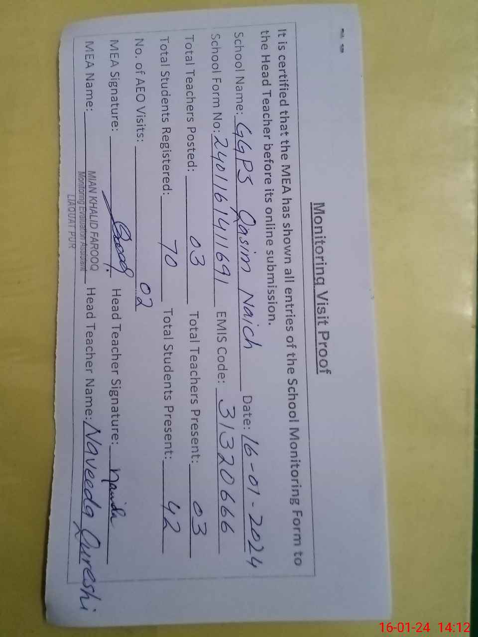| Attendance Register | Head Teacher | MEA with School | Visit Proof |