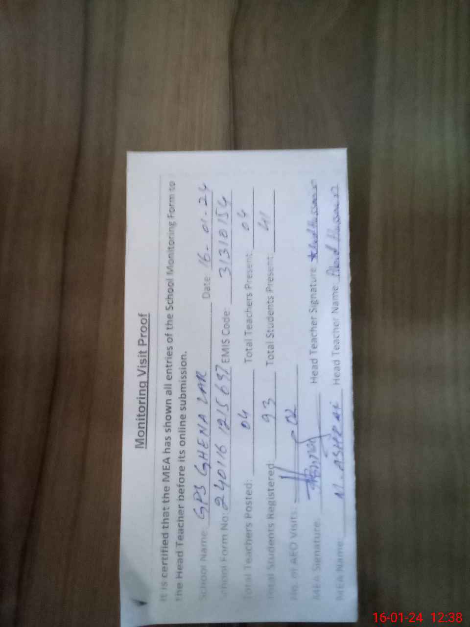| Attendance Register | Head Teacher | MEA with School | Visit Proof |