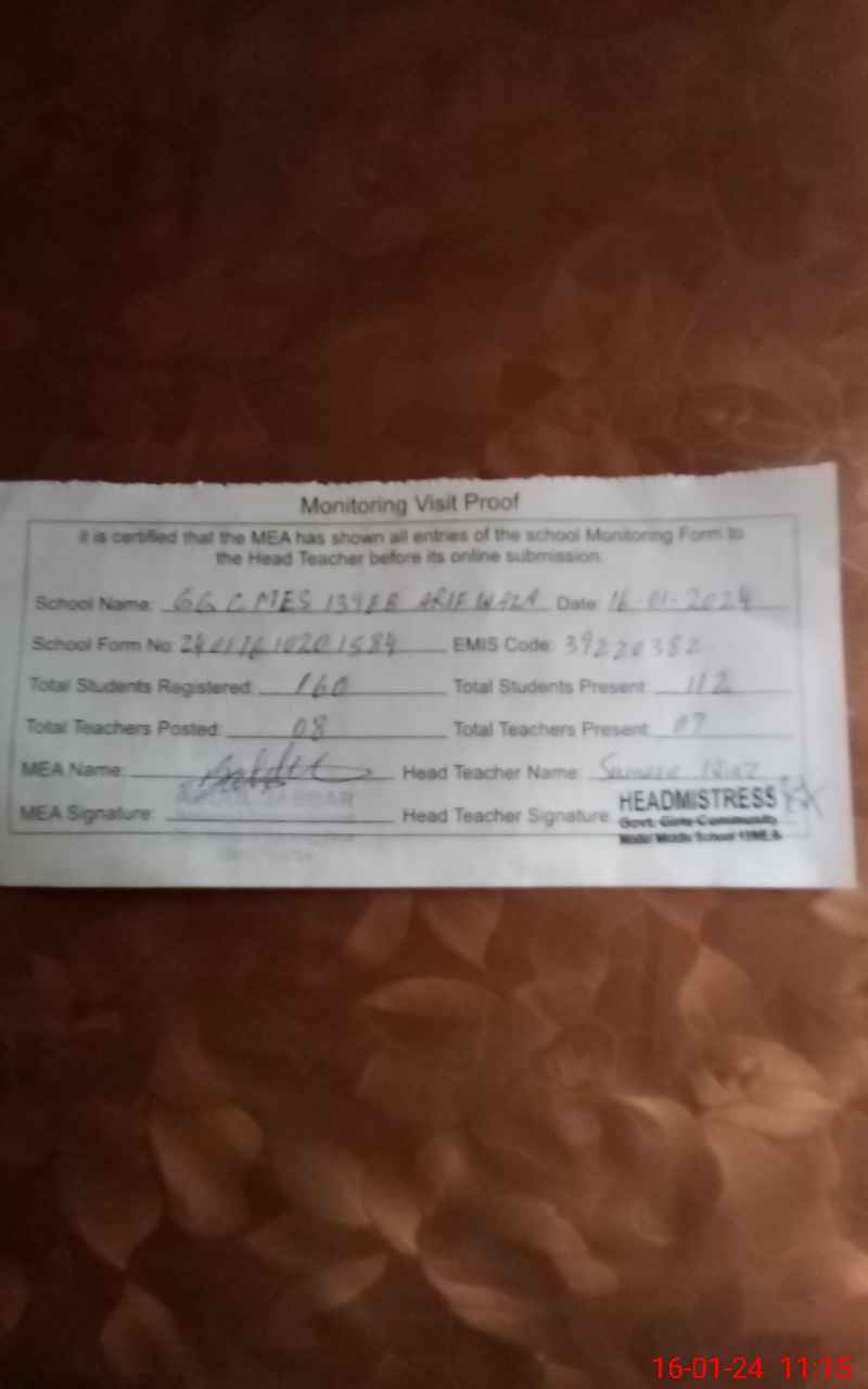 | EMIS Code: 39220382 | Name of School: GGCMES 139 EB ARIFWALA | |||