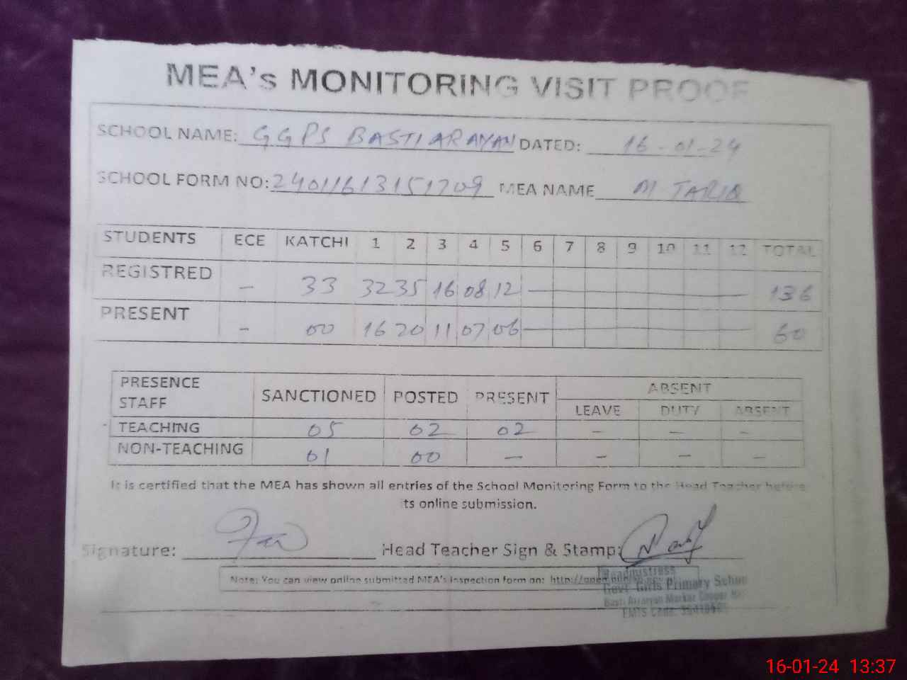 | Attendance Register | Head Teacher | MEA with School | Visit Proof |
