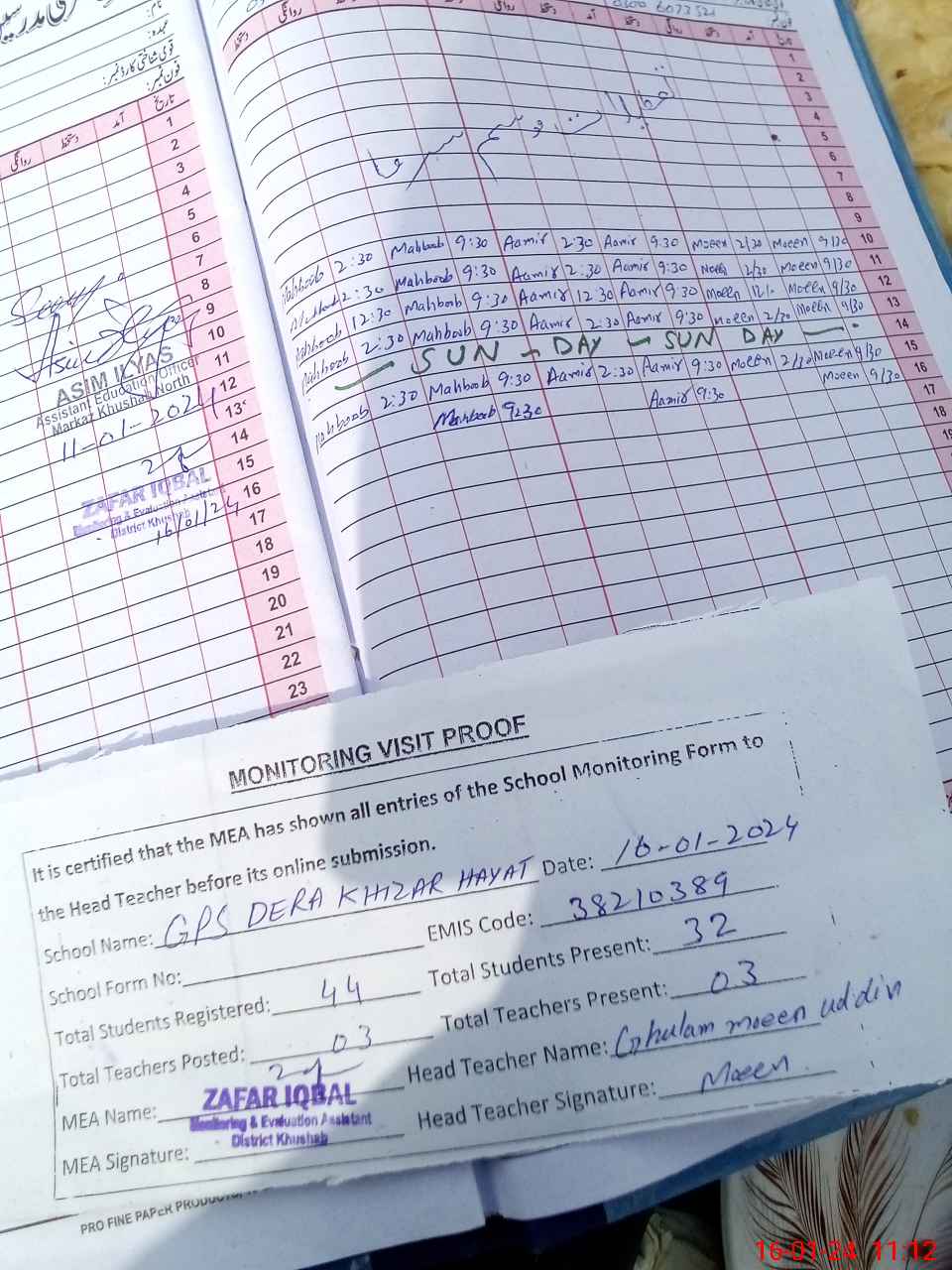 | Attendance Register | Head Teacher | MEA with School | Visit Proof |