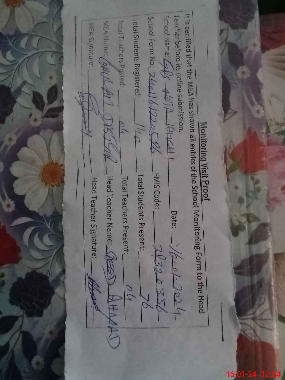 | Certified that this School was Inspected by the Undersigned MEA/DMO Today and the Information Stated Above is as Per Record. | |||||