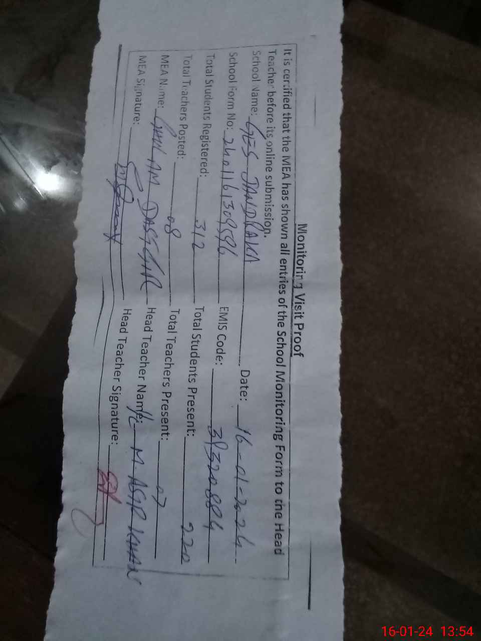 | Attendance Register | Head Teacher | MEA with School | Visit Proof |