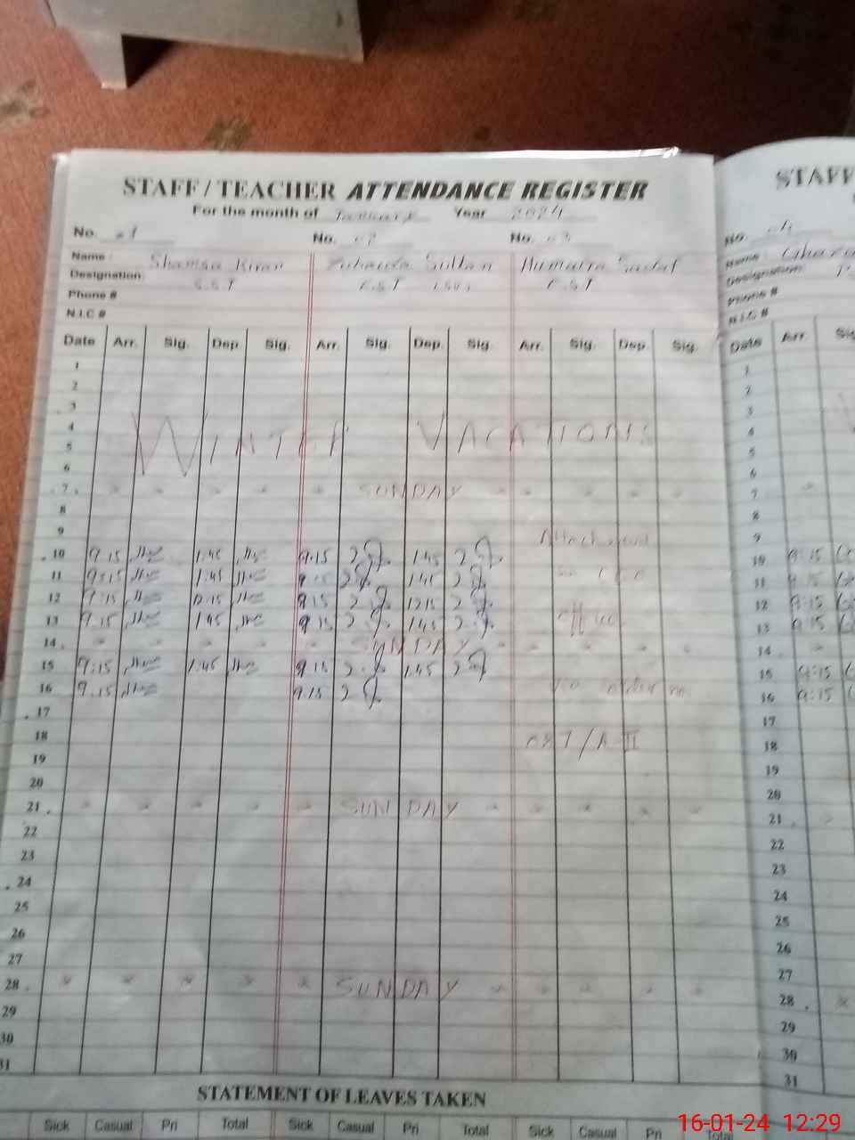 | CNIC | Full Name | Designation | R/C | Absence During Last Calender Month |