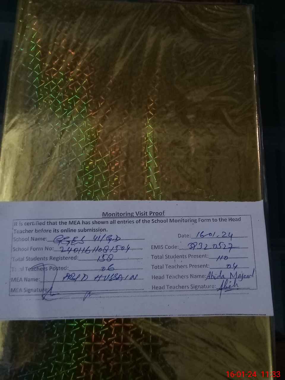 | Attendance Register | Head Teacher | MEA with School | Visit Proof |