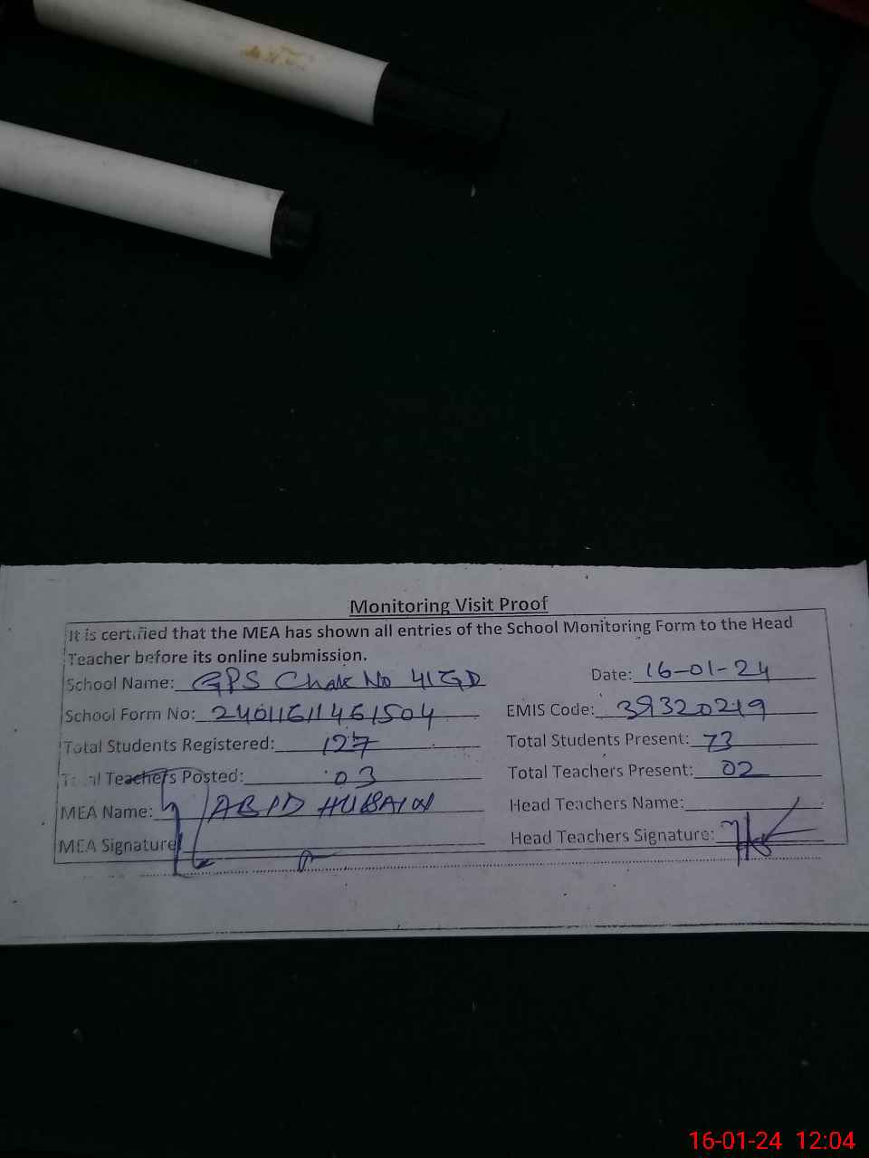 | Attendance Register | Head Teacher | MEA with School | Visit Proof |