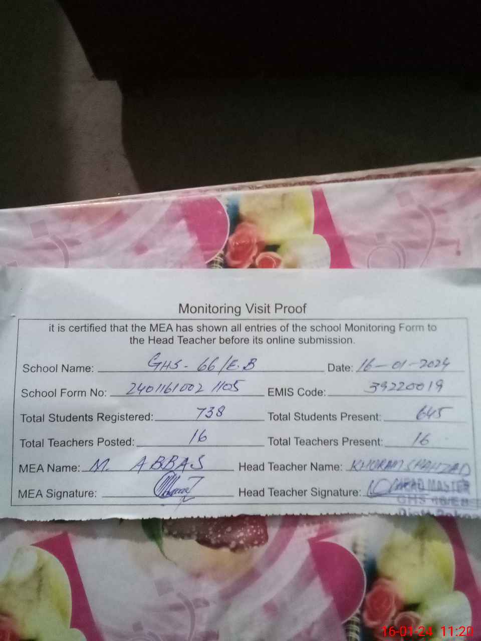 | EMIS Code: 39220019 | Name of School: GHS 66/EB ARIFWALA | |||