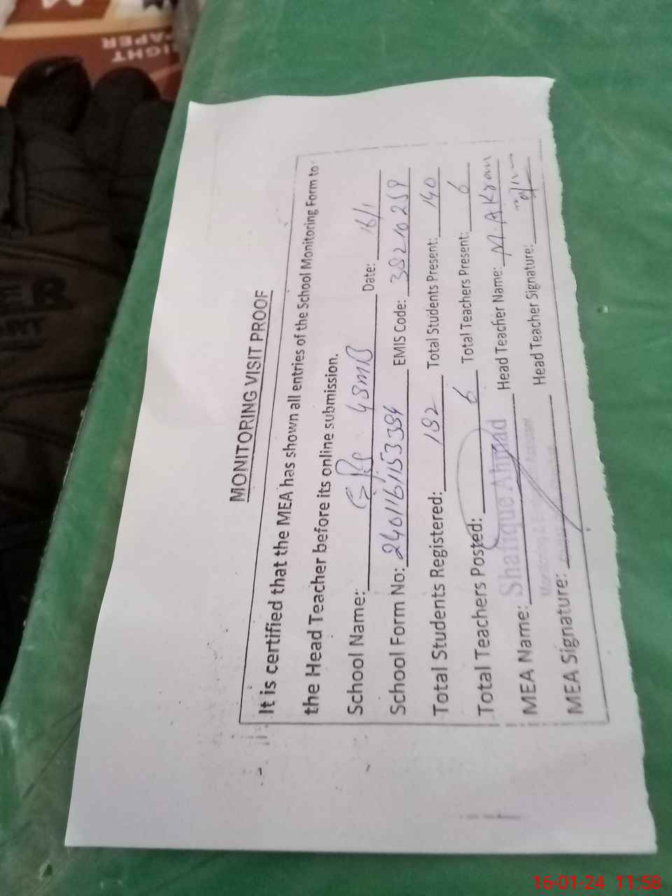 | Attendance Register | Head Teacher | MEA with School | Visit Proof |