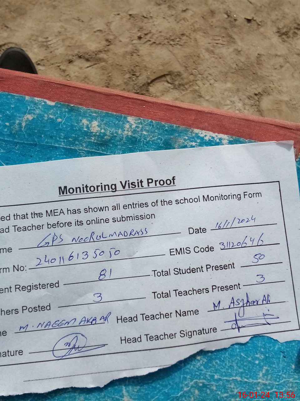 | Attendance Register | Head Teacher | MEA with School | Visit Proof |