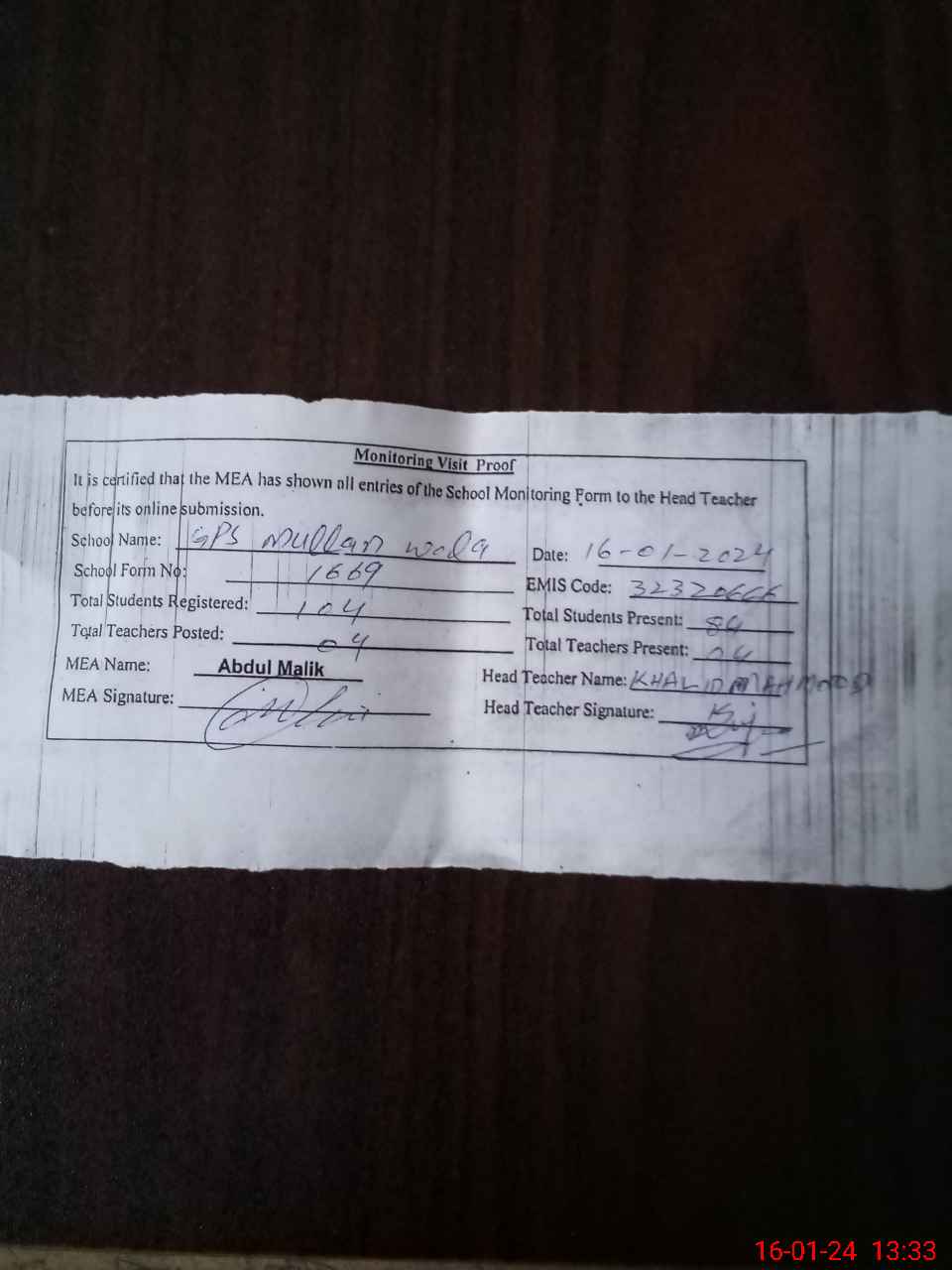 | EMIS Code: 32320666 | Name of School: GPS MULLAN WALA | |||