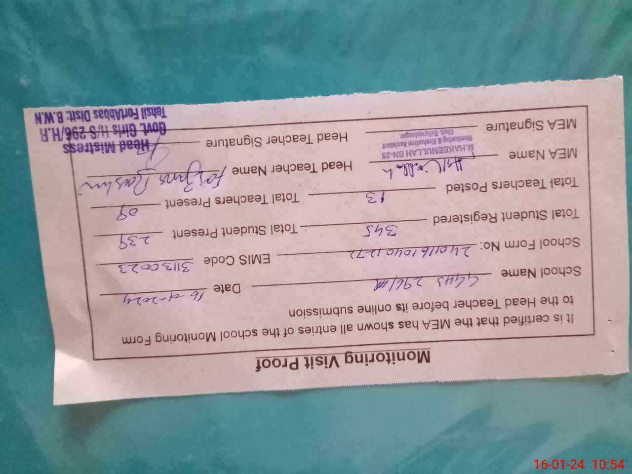 | EMIS Code: 31130023 | Name of School: GGHS CHAK NO 296 HR | |||