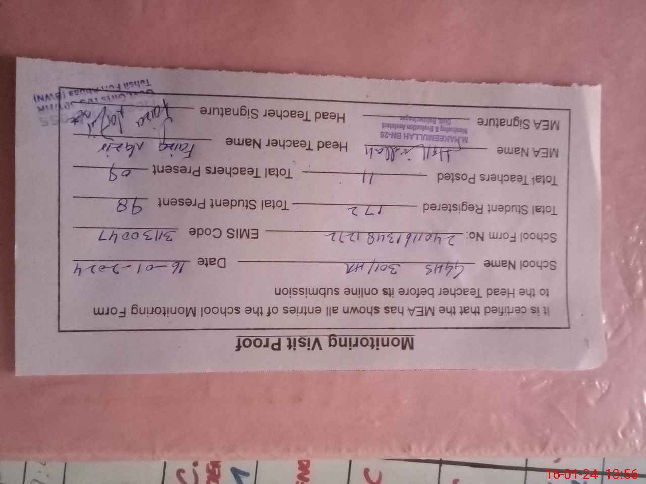 | Attendance Register | Head Teacher | MEA with School | Visit Proof |