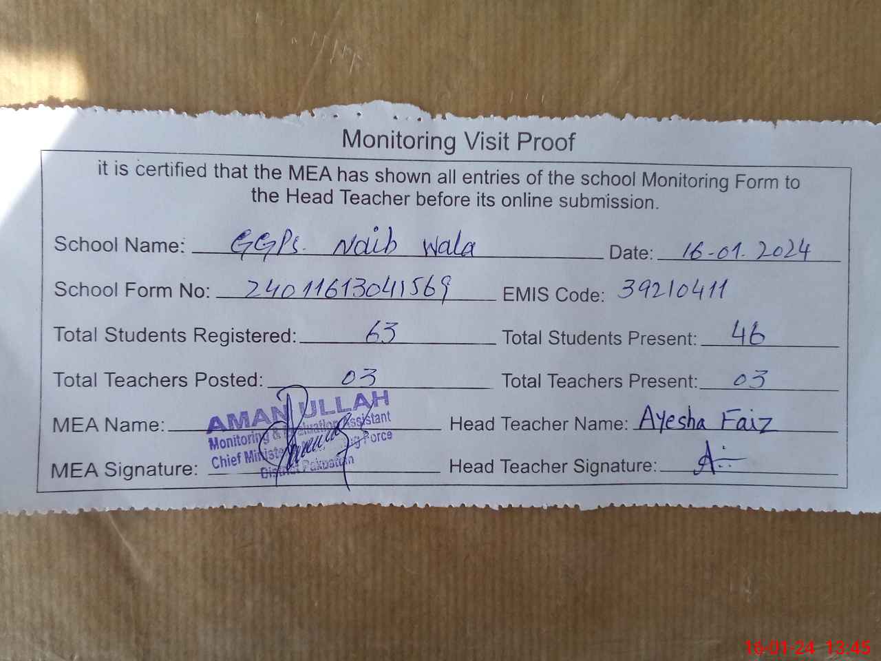 | Attendance Register | Head Teacher | MEA with School | Visit Proof |