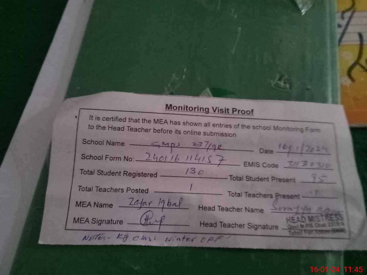 | Attendance Register | Head Teacher | MEA with School | Visit Proof |