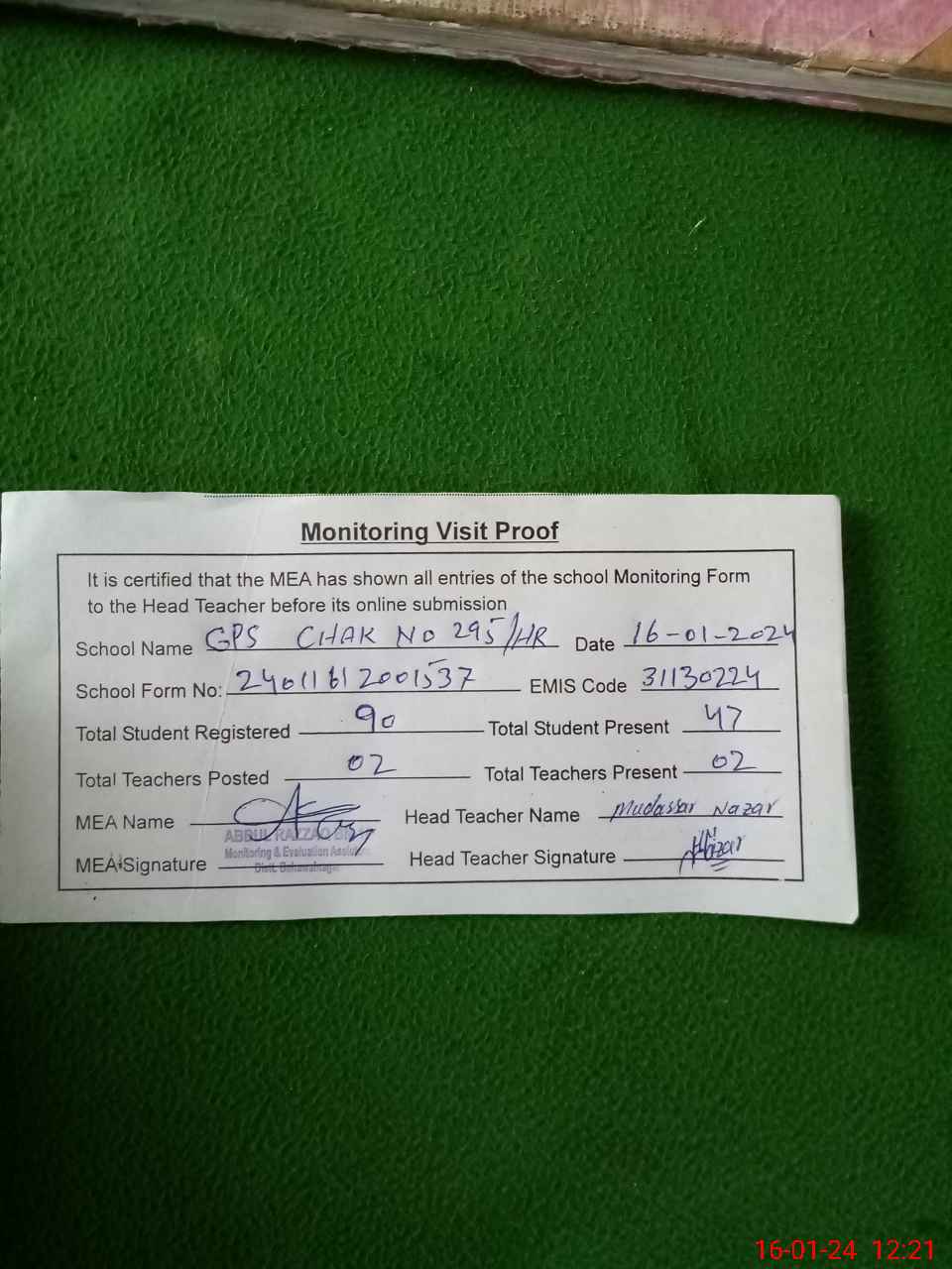 | EMIS Code: 31130224 | Name of School: GPS CHAK NO 295 HR | |||