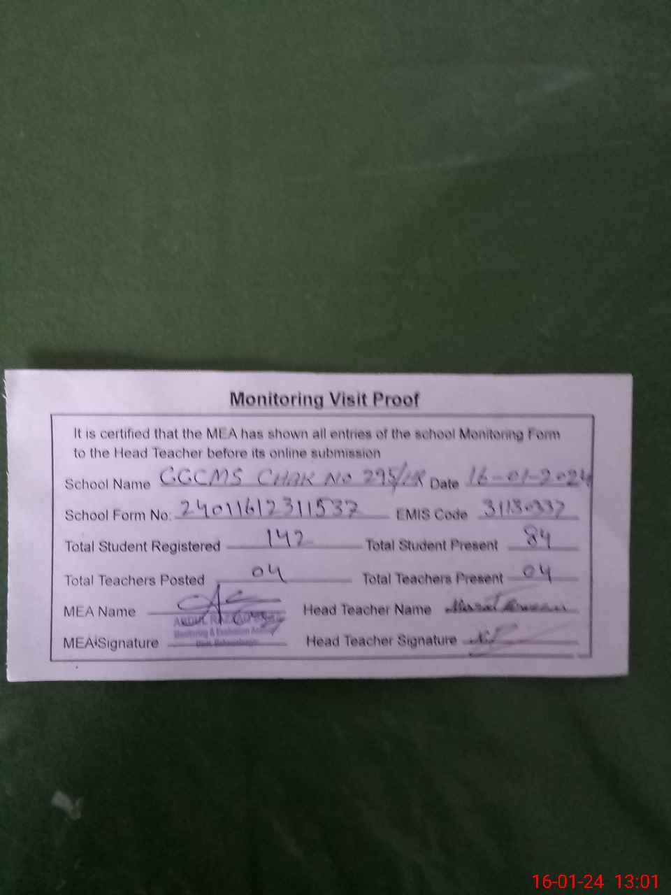 | EMIS Code: 31130337 | Name of School: GGCMS CHAK NO. 295 HR | |||