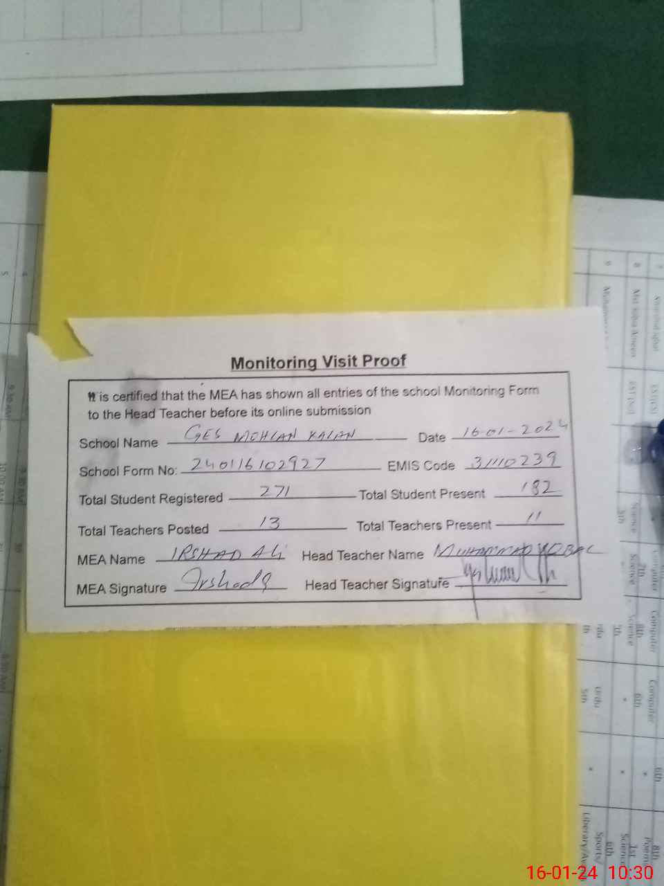 | Attendance Register | Head Teacher | MEA with School | Visit Proof |