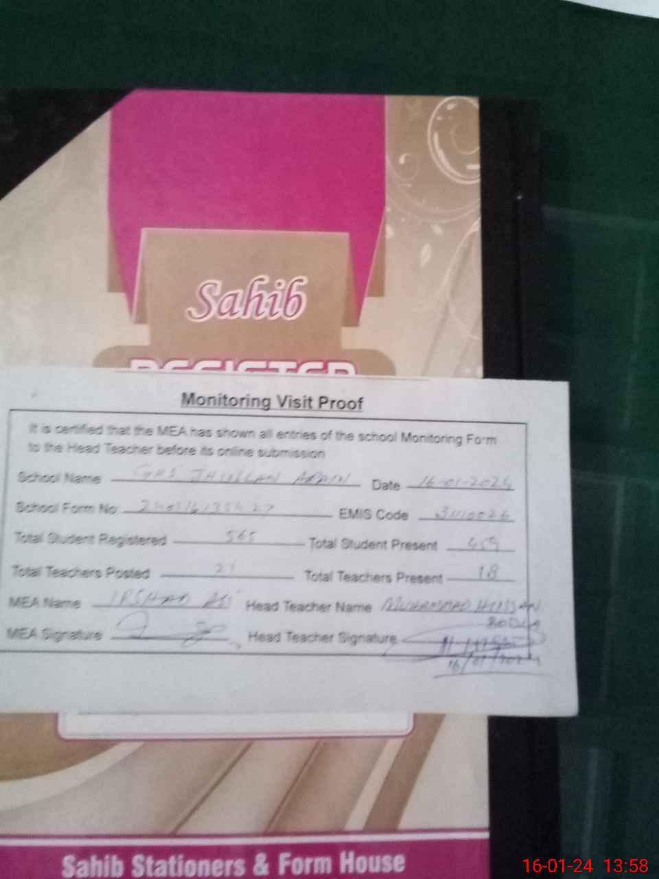 | EMIS Code: 31110026 | Name of School: GHS JHULLAN ARAIN | |||