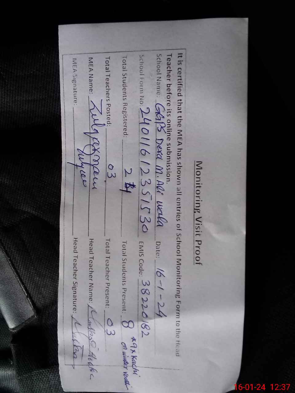 | Attendance Register | Head Teacher | MEA with School | Visit Proof |