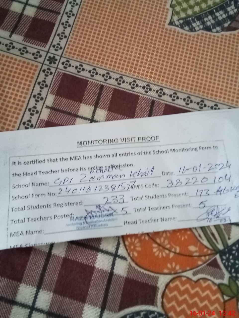 | Attendance Register | Head Teacher | MEA with School | Visit Proof |