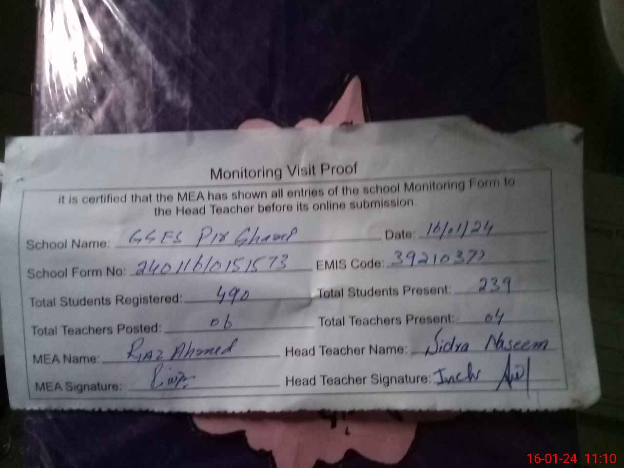 | Attendance Register | Head Teacher | MEA with School | Visit Proof |