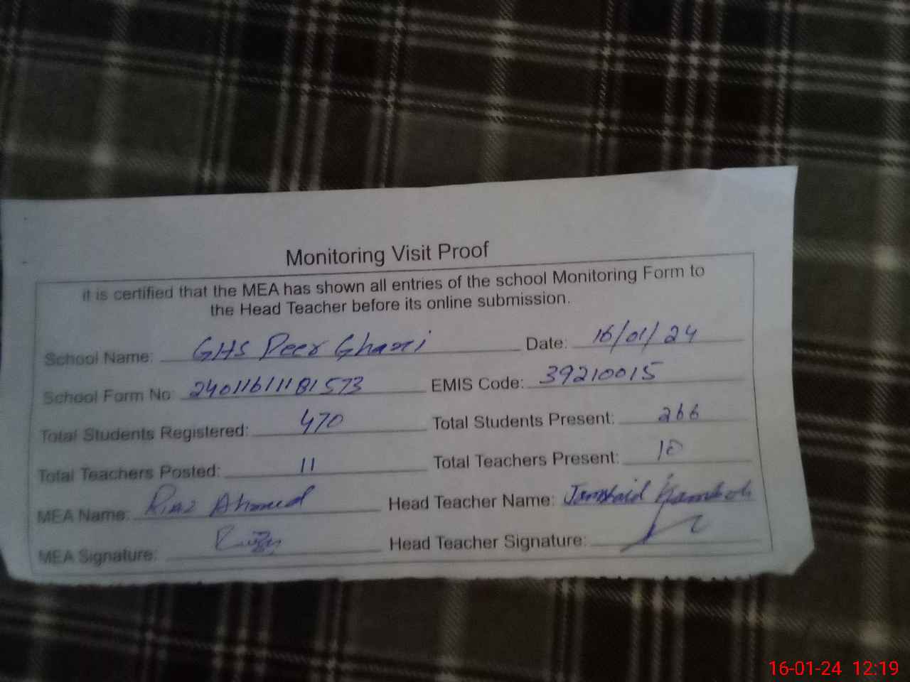 | EMIS Code: 39210015 | Name of School: GHS PEER GHANI | |||