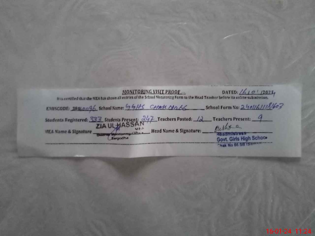 | Monitoring Date: 16-01-2024 | Start Time: 16-01-2024 10:57 AM | End Time: 16-01-2024 11:24 AM | Name of MEA: ZI**** ULHA**** | |