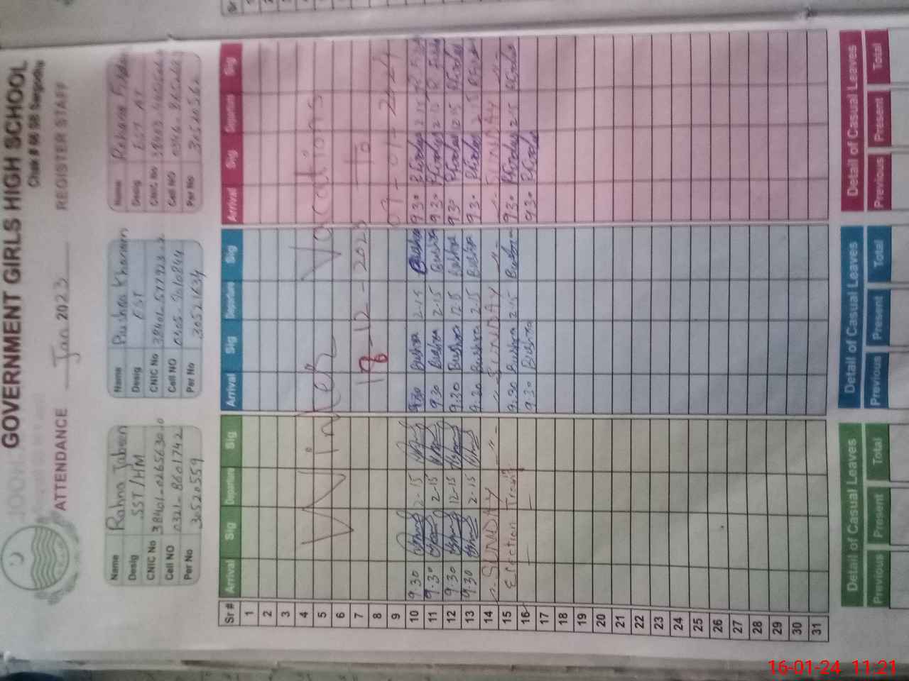 | CNIC | Full Name | Designation | R/C | Absence During Last Calender Month |