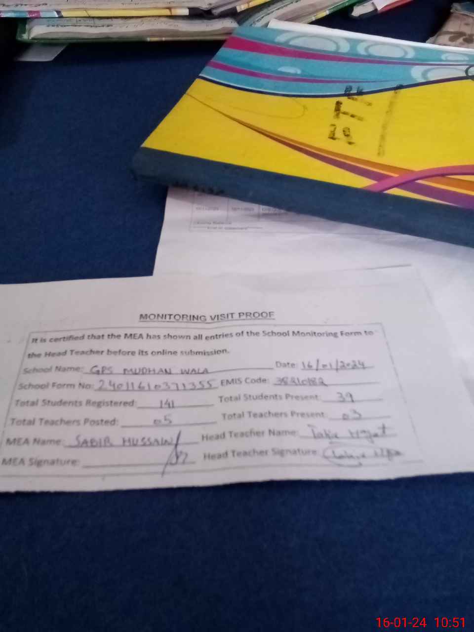 | Attendance Register | Head Teacher | MEA with School | Visit Proof |