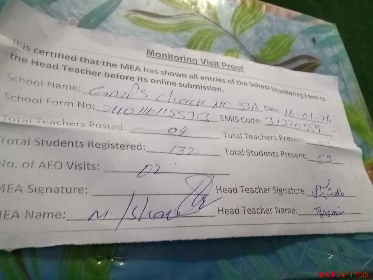 | EMIS Code: 31320559 | Name of School: GMPS CHAK NO. 33/A | |||