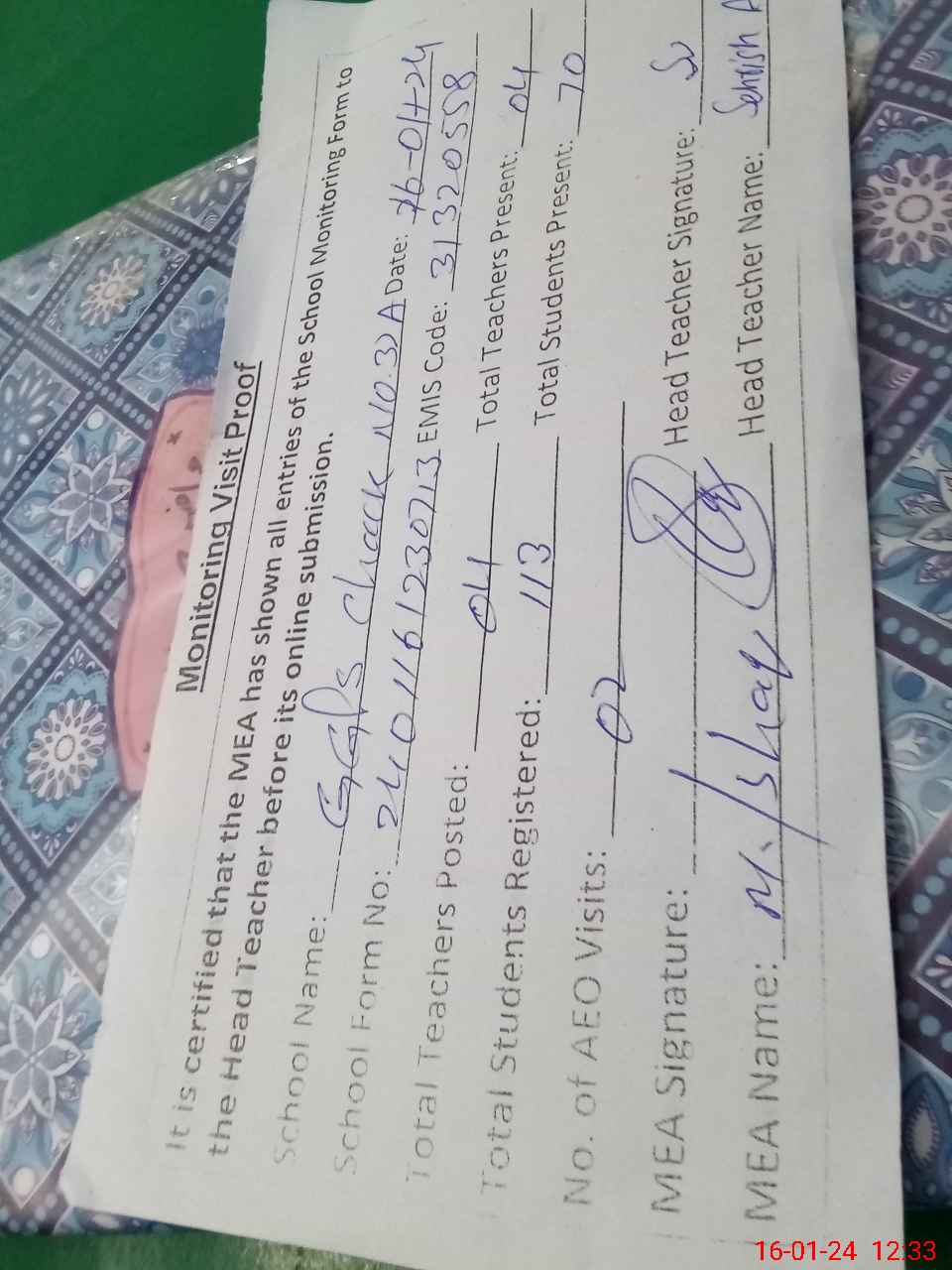 | Attendance Register | Head Teacher | MEA with School | Visit Proof |