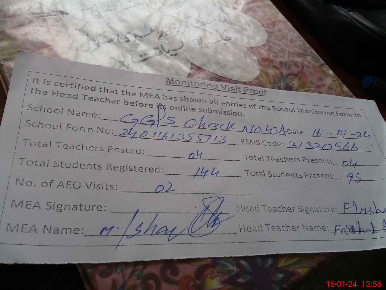 | EMIS Code: 31320566 | Name of School: GGPS CHAK 43/A | |||