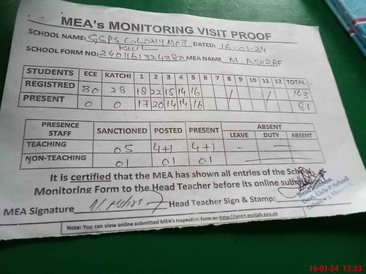 | Attendance Register | Head Teacher | MEA with School | Visit Proof |