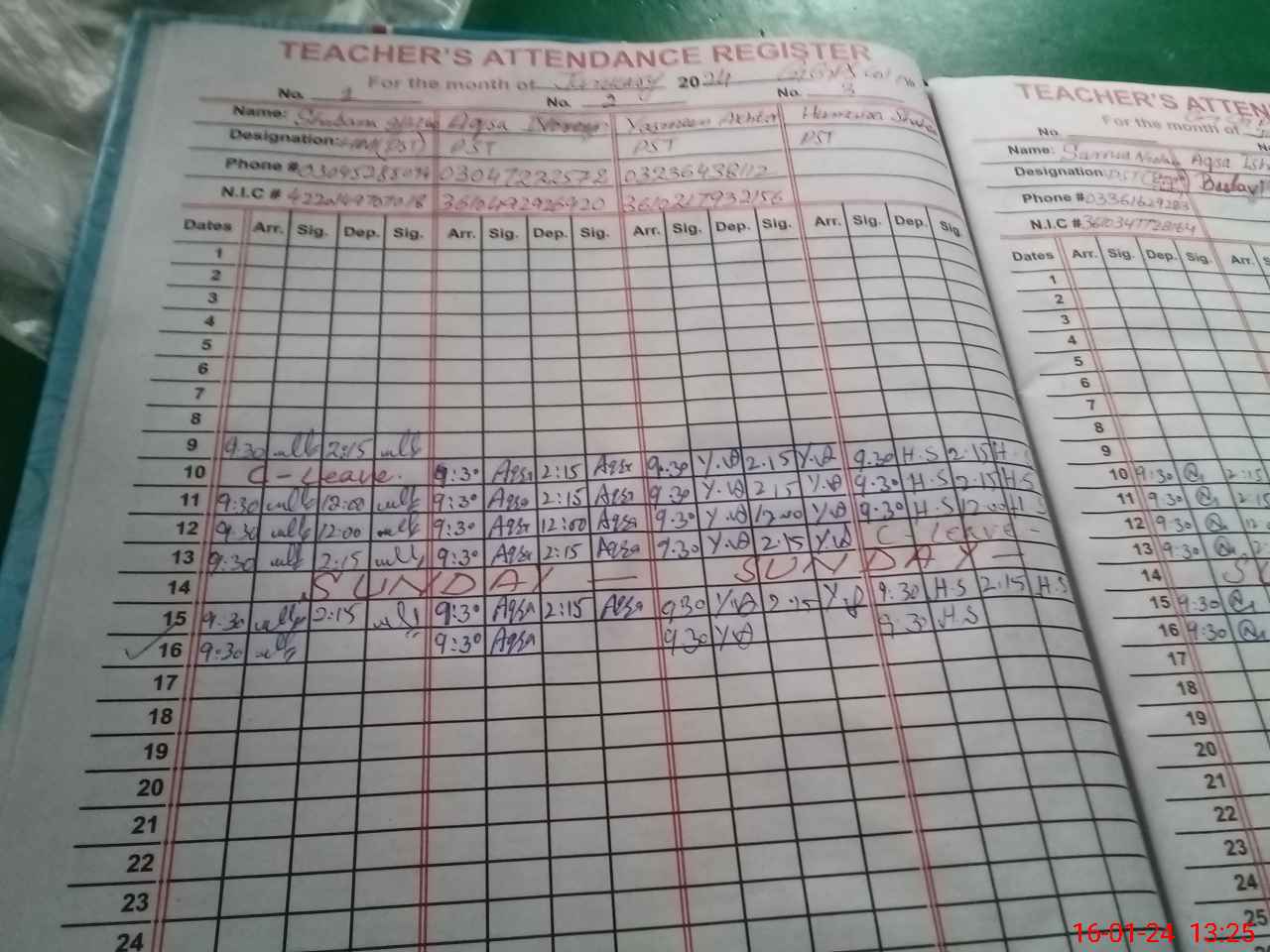 | CNIC | Full Name | Designation | R/C | Absence During Last Calender Month |