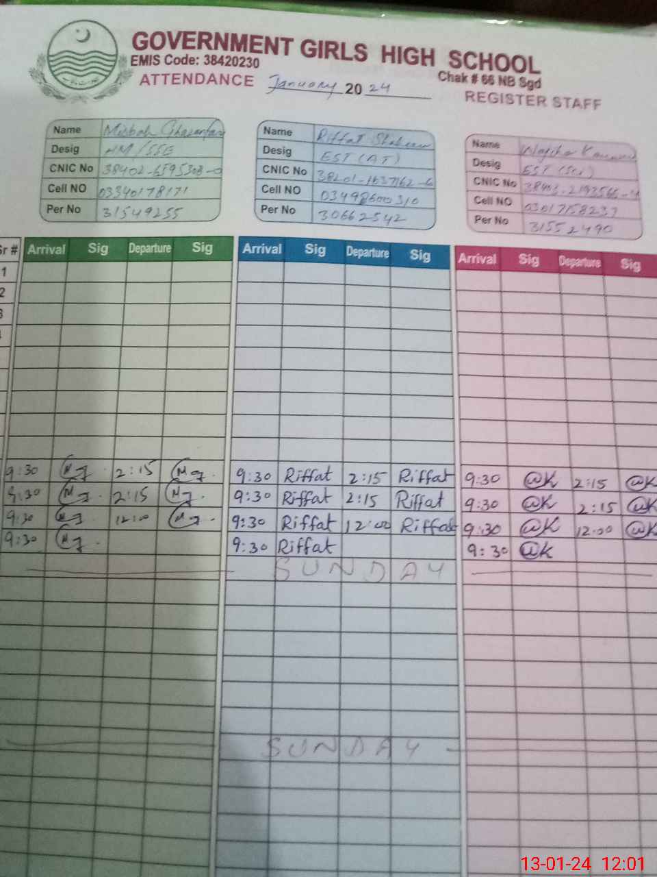 | Remarks (Use Separate Page if Required): Syeda Riffat Zehra EST attached with GGHS Block 14 Sargodha since 8 November 2024 | |||||