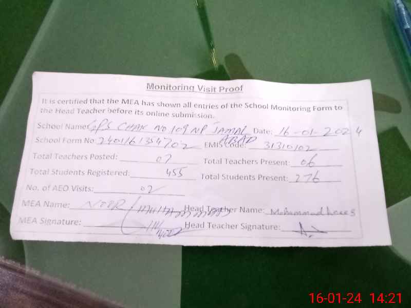| EMIS Code: 31310102 | Name of School: GPS CHAK 109/NP JAMAL ABAD | |||