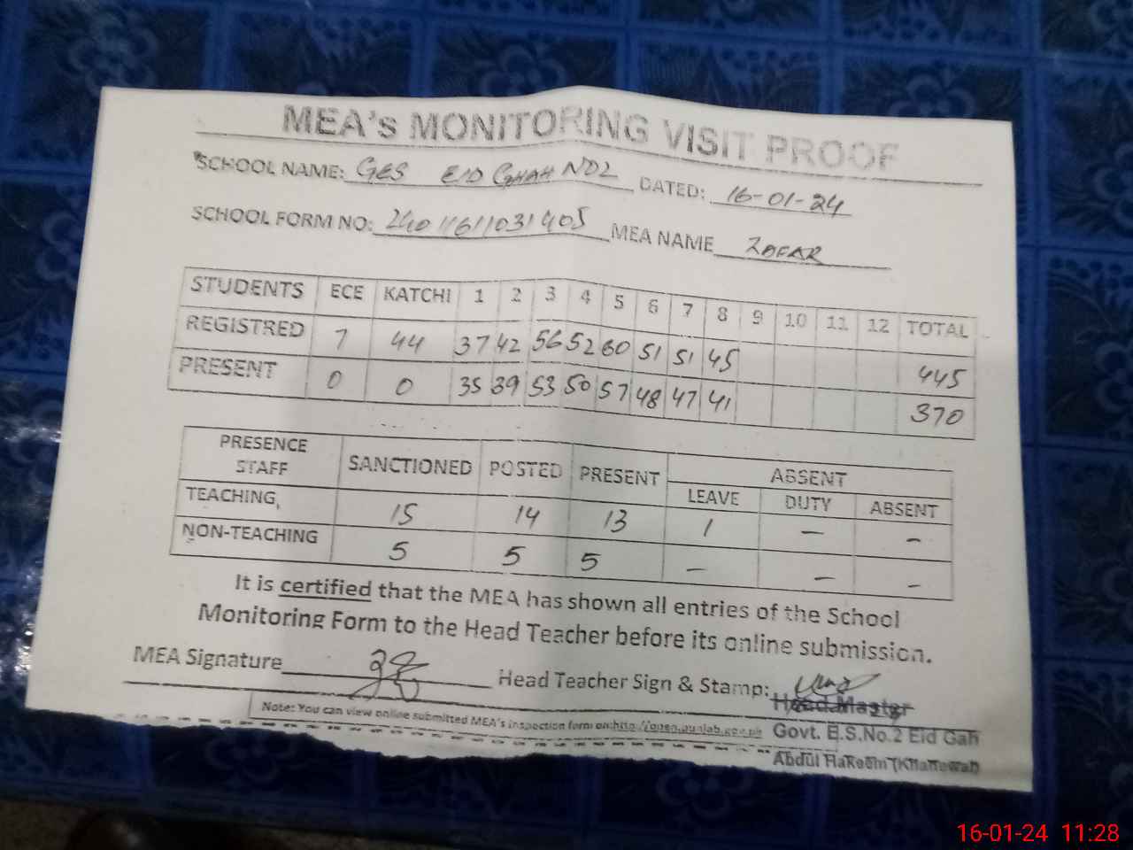 | Attendance Register | Head Teacher | MEA with School | Visit Proof |