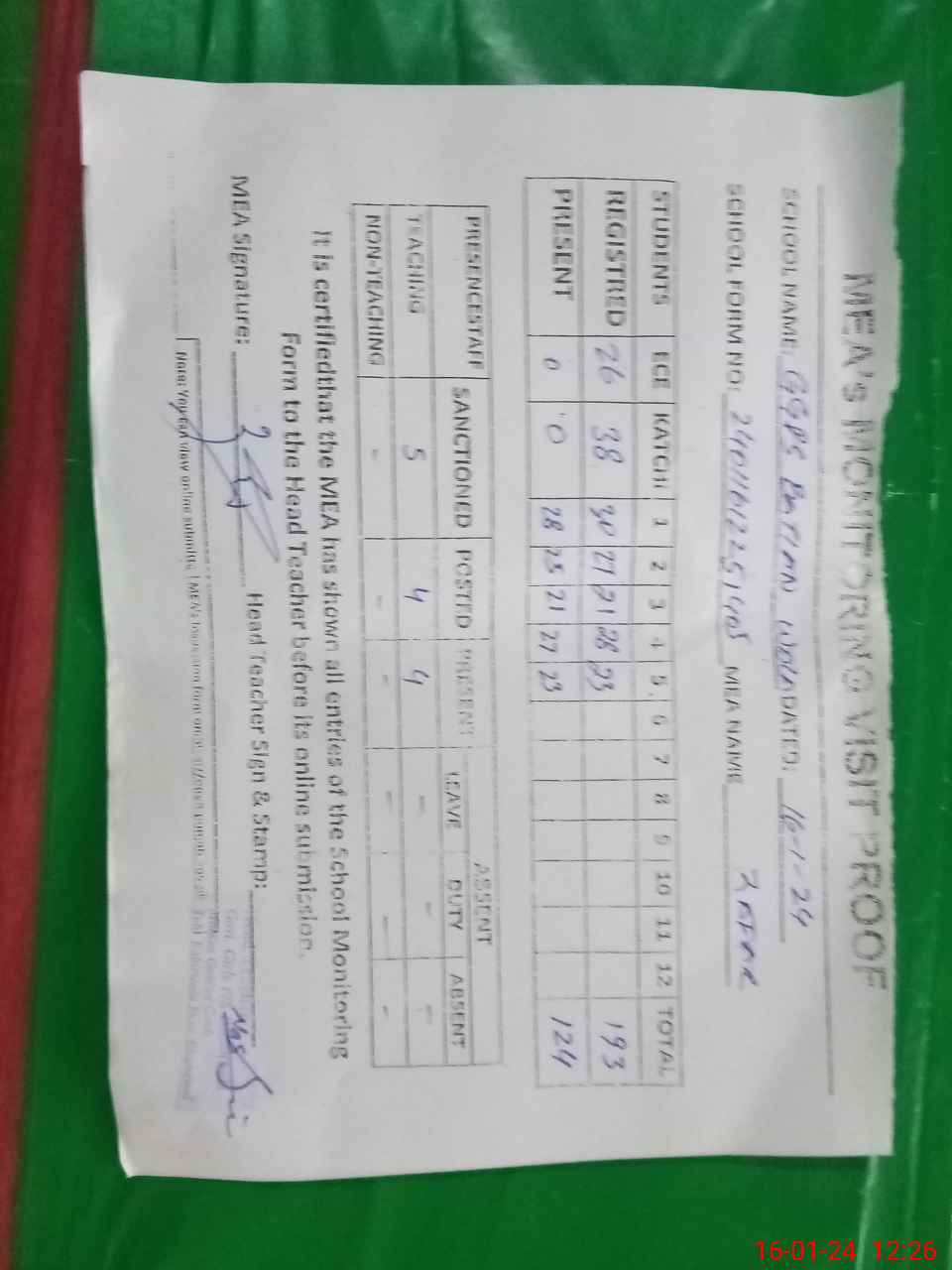 | Attendance Register | Head Teacher | MEA with School | Visit Proof |