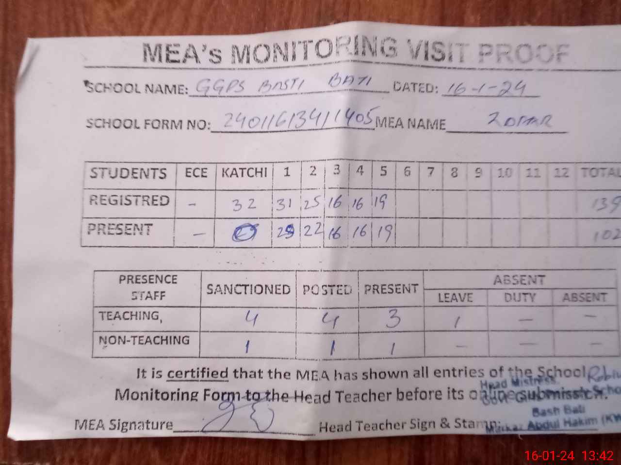 | Attendance Register | Head Teacher | MEA with School | Visit Proof |