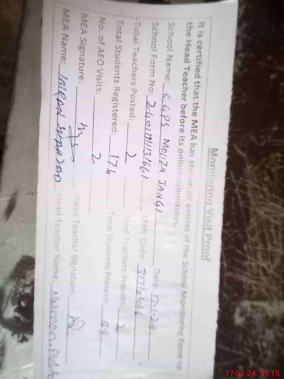 | EMIS Code: 31310446 | Name of School: GGPS MOZA JAHANGI | |||