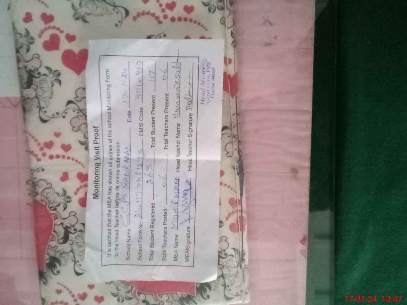 | Attendance Register | Head Teacher | MEA with School | Visit Proof |
