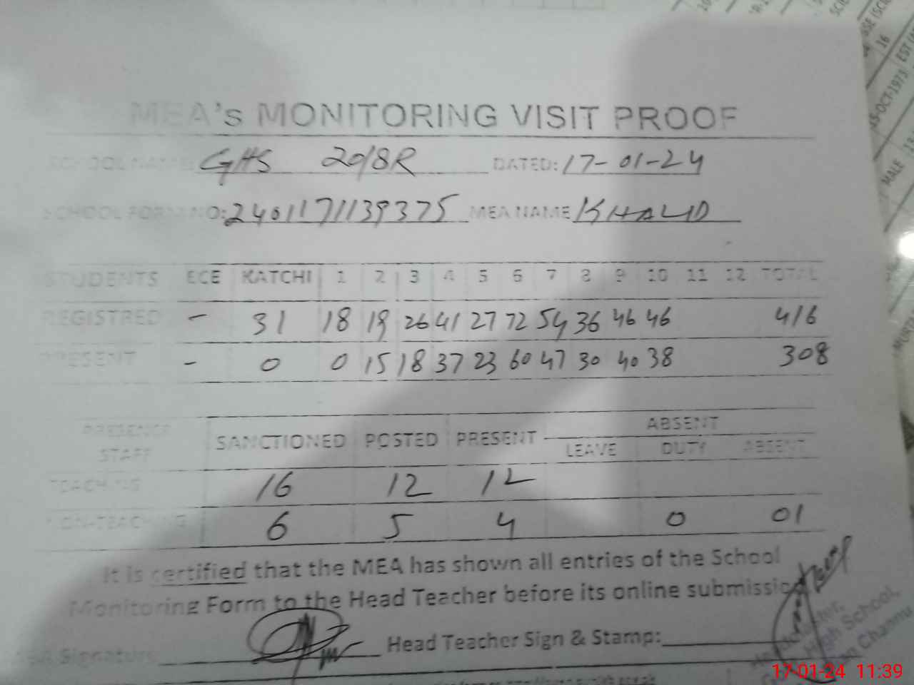 | Attendance Register | Head Teacher | MEA with School | Visit Proof |