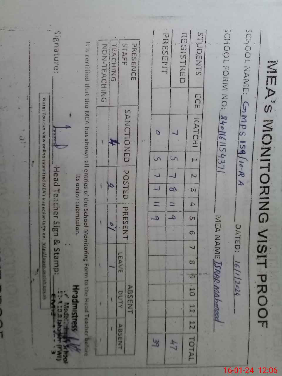 | Attendance Register | Head Teacher | MEA with School | Visit Proof |