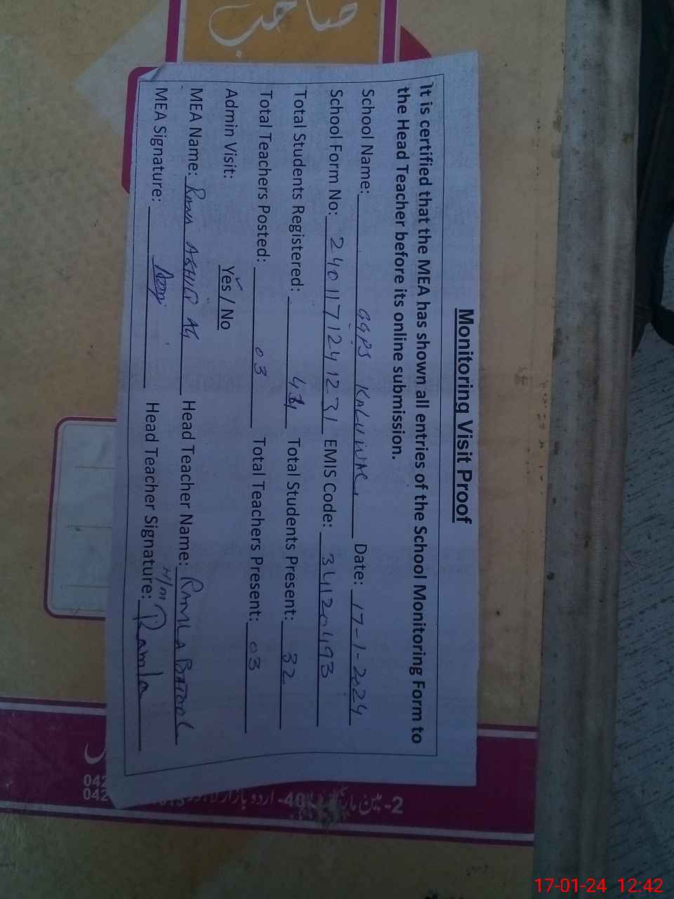 | EMIS Code: 34120493 | Name of School: GGPS KALU WALI | |||